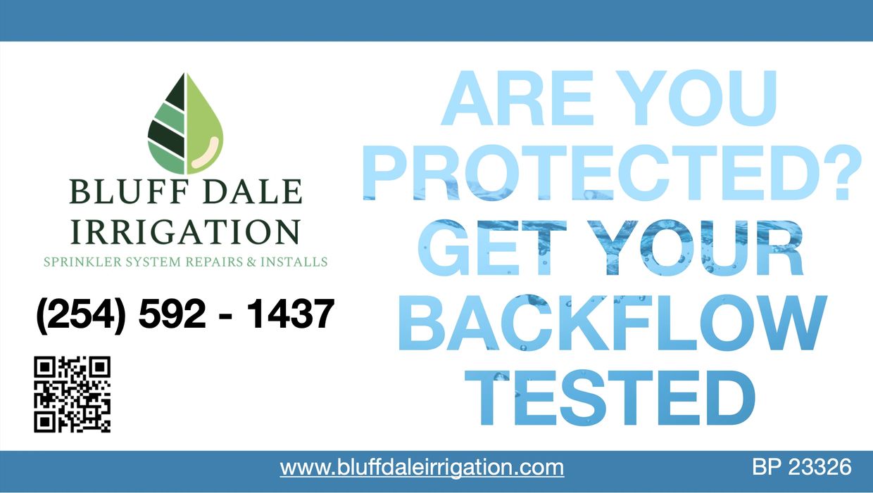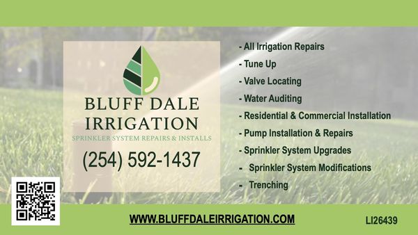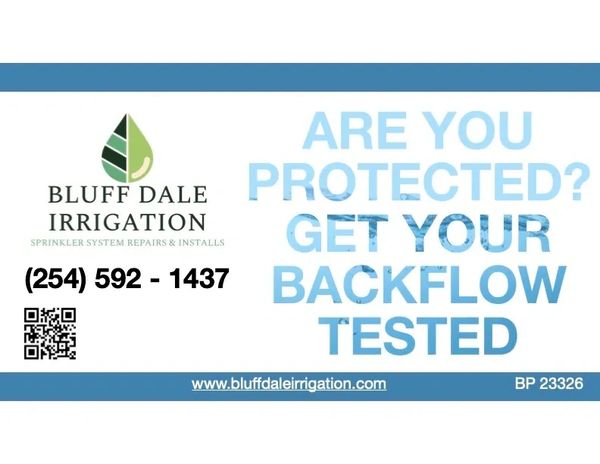 Office # 254-592-1437 bluffdaleirrigation@gmail.com -------------------------------------------------- Lee Tankersley & Noemi Tankersley (Owner & Operator) FULLY LICENED & INSURED: LI 26439 BPAT by Noemi Tankersley: BP 23326